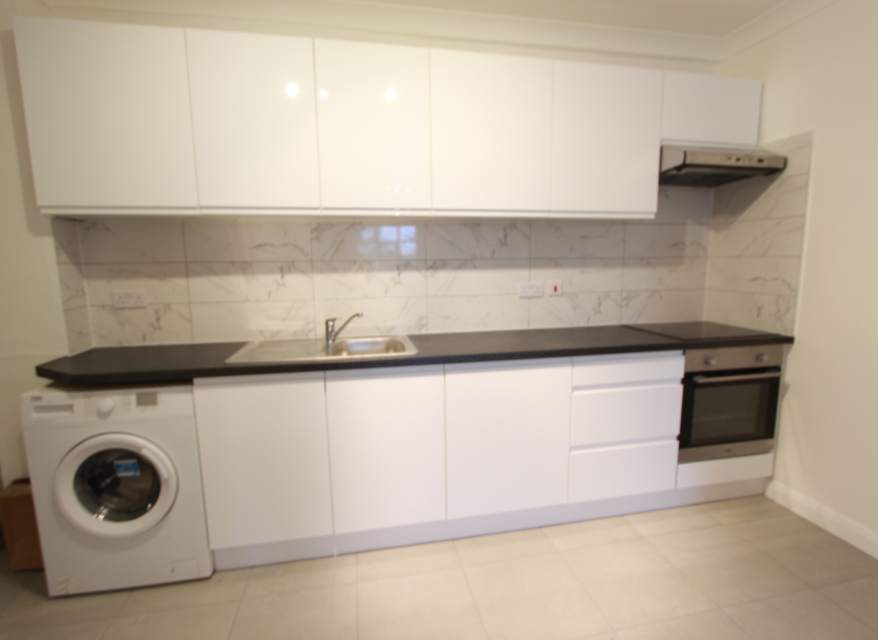 Fully fitted kitchen with washing machine, oven, hob and fridge freezer